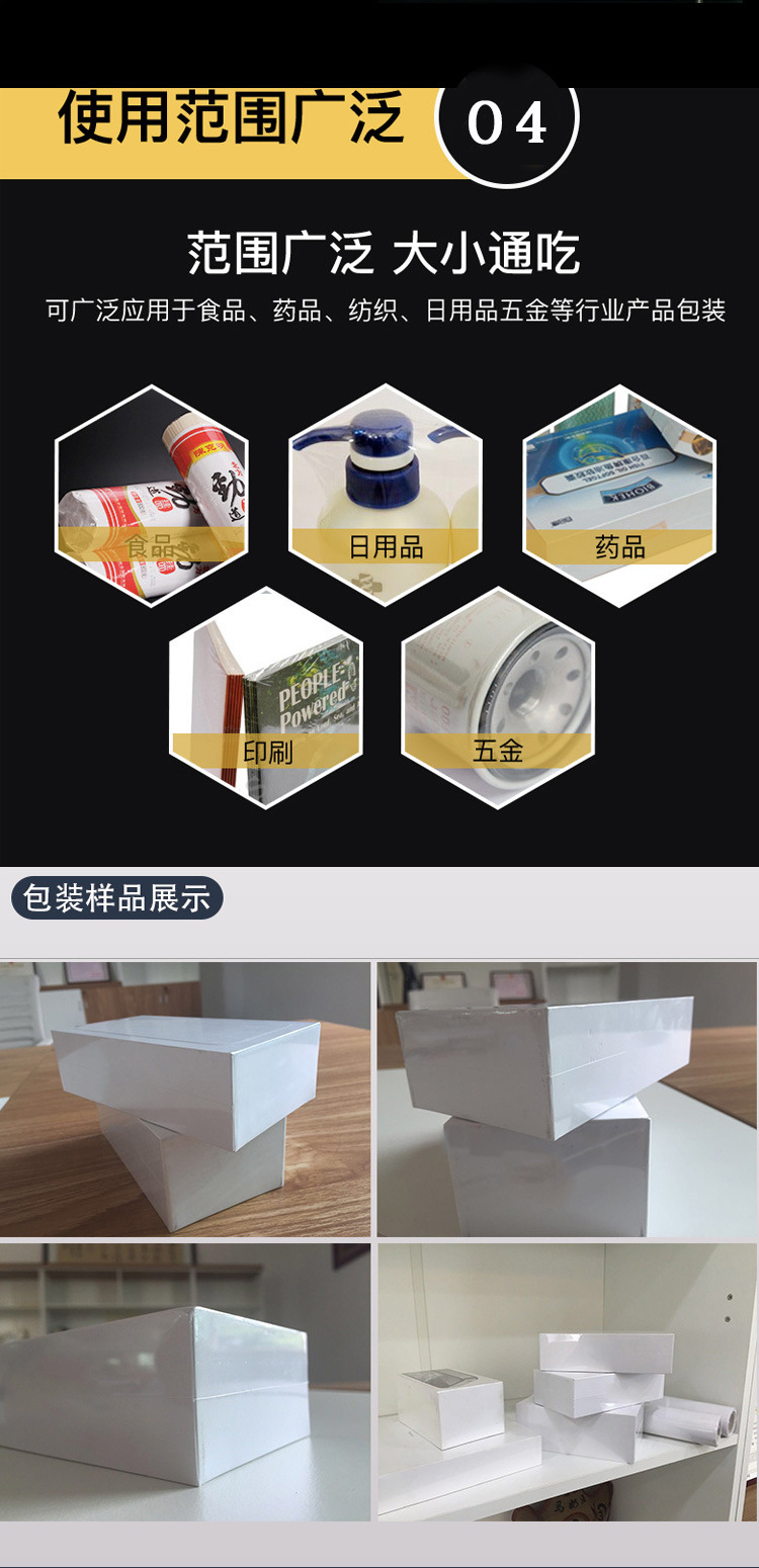 - 保護(hù)產(chǎn)品:熱收縮膜形成的保護(hù)層能夠有效防止產(chǎn)品受到外部沖擊、污染,具有防潮、防塵、防竊等功能,保障產(chǎn)品的質(zhì)量和安全。