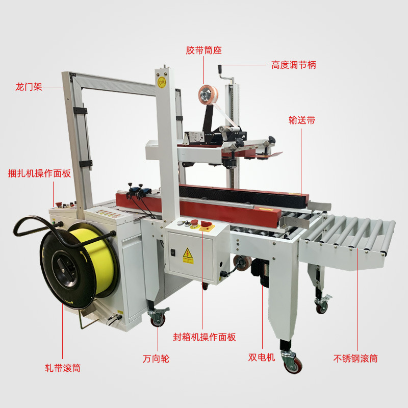 封箱打包一體機是一種機電一體化的自動裝箱設備,?它結合了自動折蓋封箱機和全自動捆包機,?形成了一個完整的包裝流水線系統。?這種機器特別適用于食品、?醫藥、?日化等行業,?能夠處理各種大小貨物的打包捆扎,?包括紙箱打包、?紙張打包、?藥箱打包等。?它的設計特點是臺面滾筒無動力,?針對顧客封箱及捆包雙機一體設計,?使得封箱、?捆包作業一體化,?提高了工作效率,?降低了人力成本。?